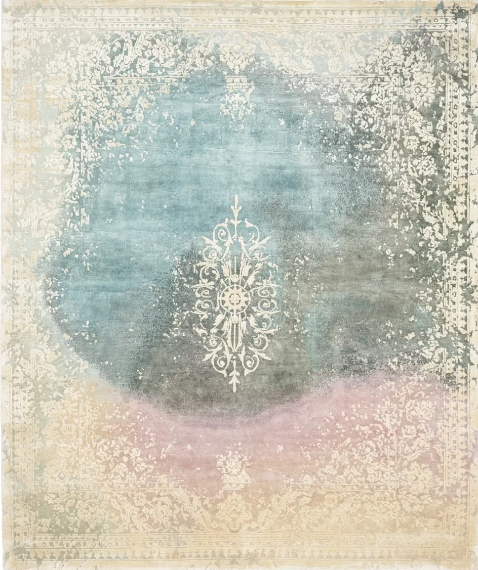 The design blends the contemporary depth of the Avio colourway with a carefully distressed finish, where subtle layers of white, gentle greys, olive shadows and muted washes of turquoise and petal pink emerge through the surface, creating a calm yet dimensional surface. Classical ornament appears at the centre and edges like a faint imprint, softened by time and intentionally eroded into abstraction.