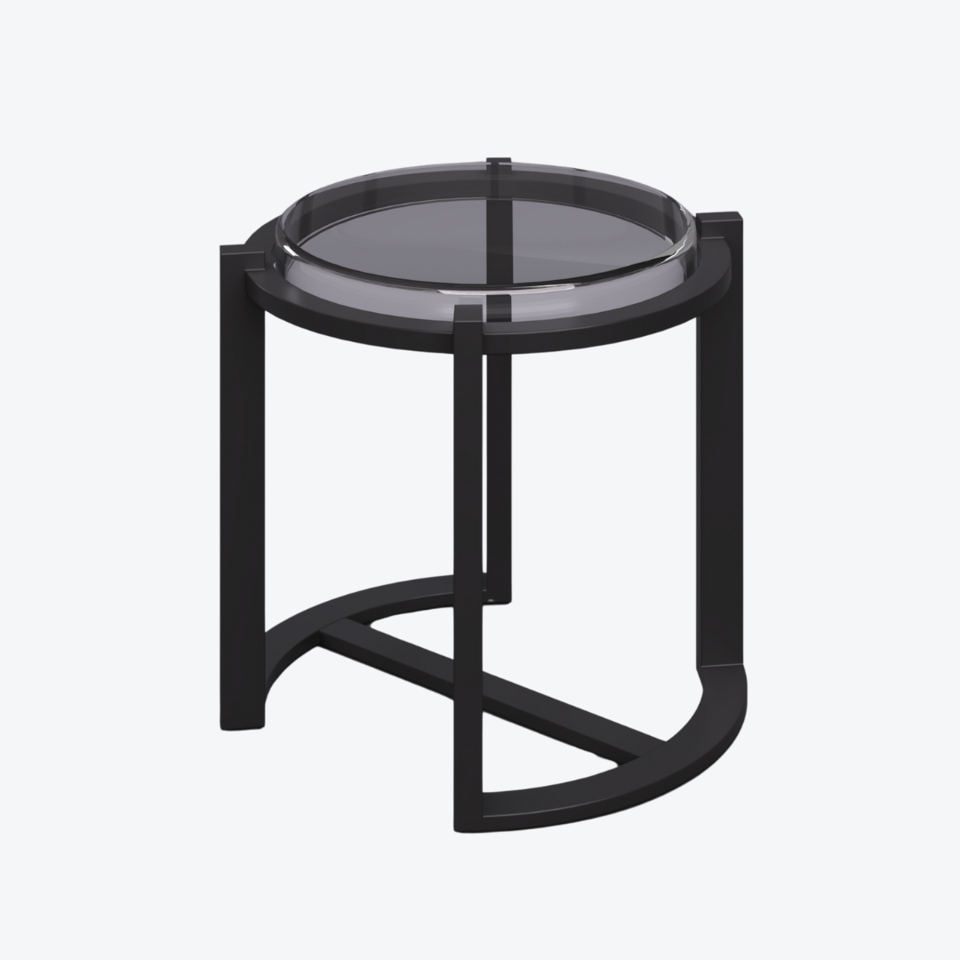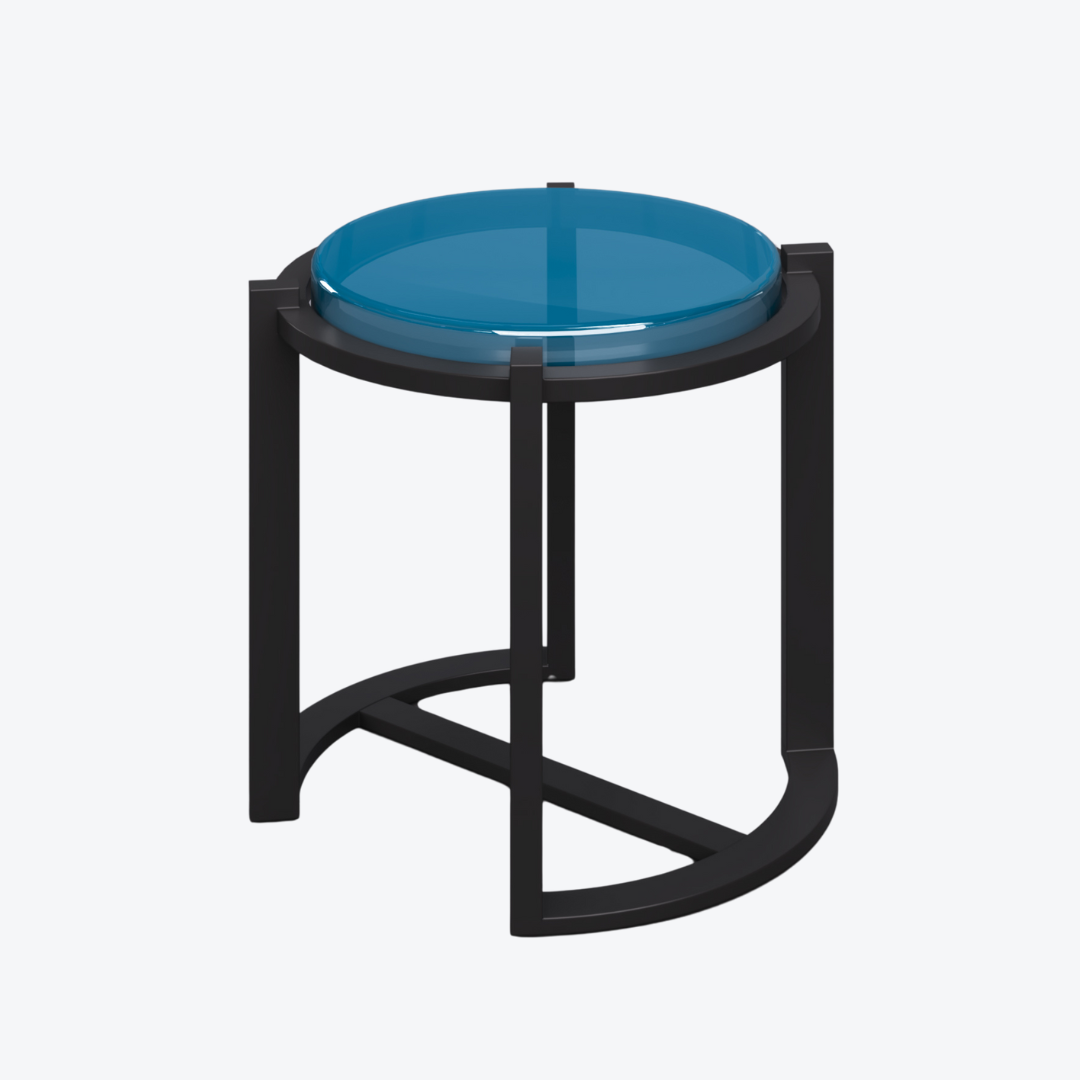 This side table pairs a cast-glass top with a frame in black-patinated aluminum, creating a striking contrast of texture and tone. It comes in light blue and clear glass top, revealing a distinct play of light and material depth. Refined yet bold, the piece embodies the harmony between luminous glass and matte metal, where modern precision meets artisanal craft.