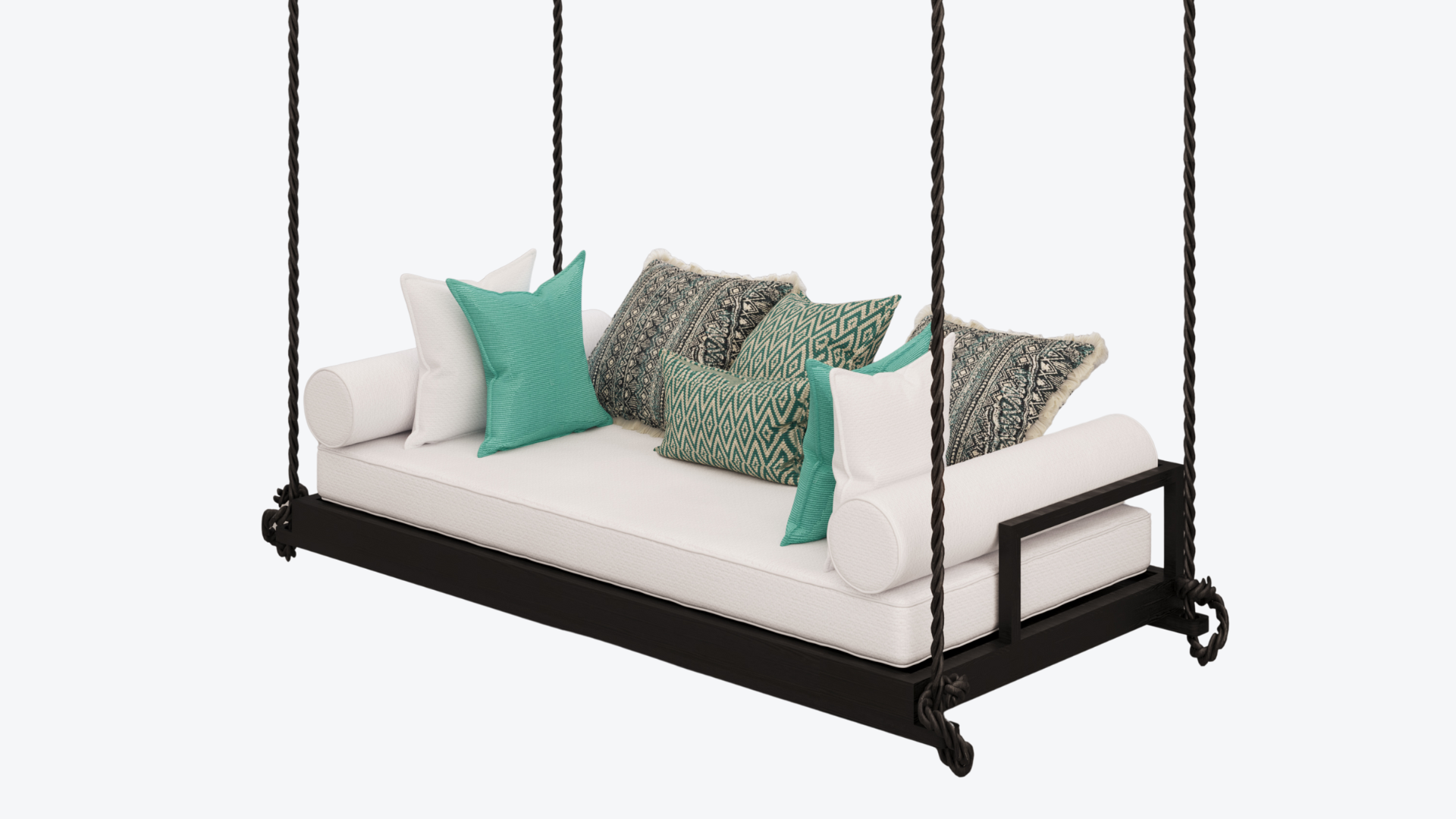 Crafted from solid golden Burmese teak with a black-stained, wire-brushed finish, this hanging lounge unites durability with refined craftsmanship. The structure features marine-grade black rope and a hot-dip galvanized steel frame for lasting strength, complemented by quick-dry foam cushions upholstered in water-resistant fabric. Designed for both comfort and resilience, it embodies an elegant dialogue between natural timber, tactile detail and outdoor performance.