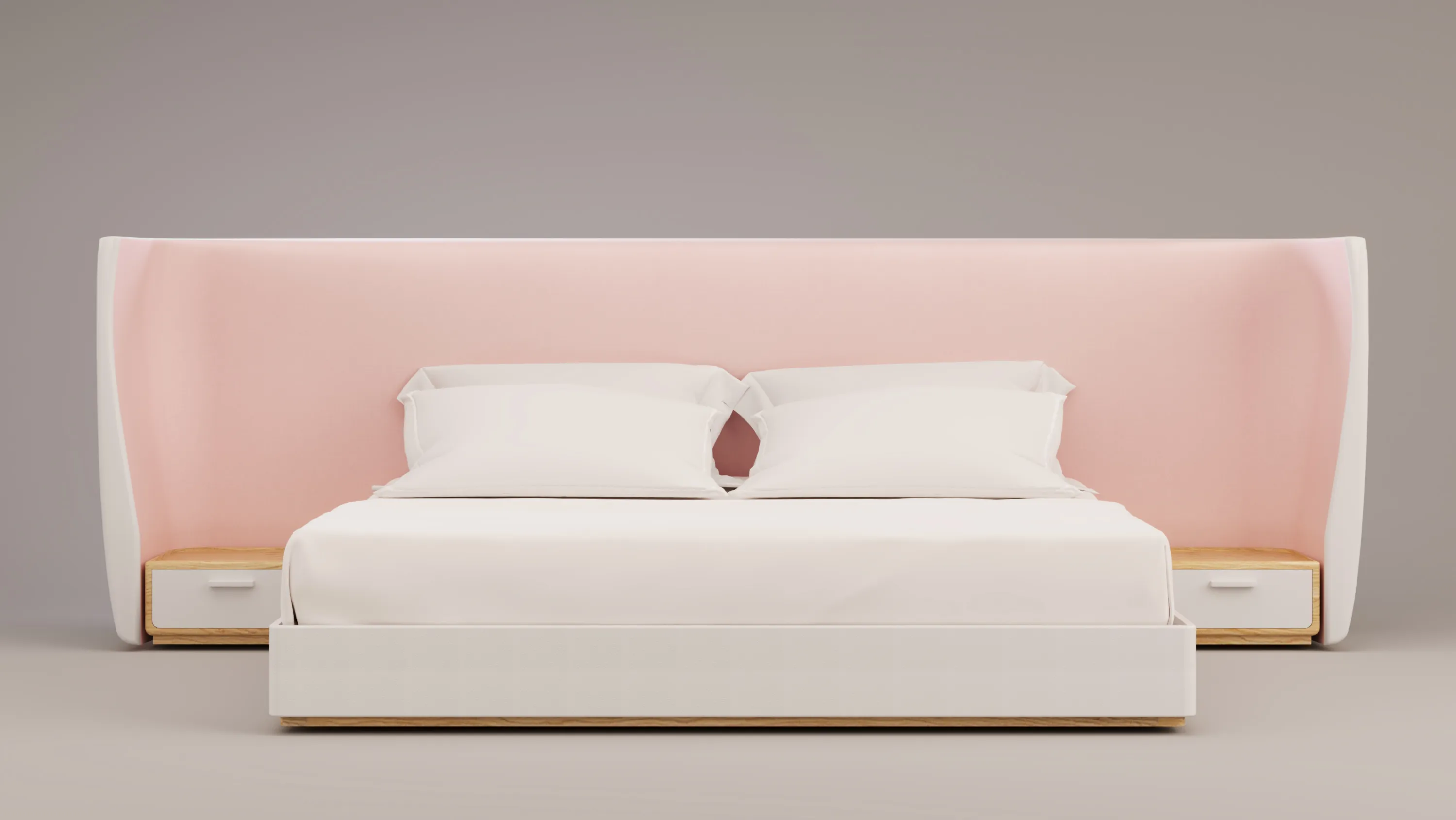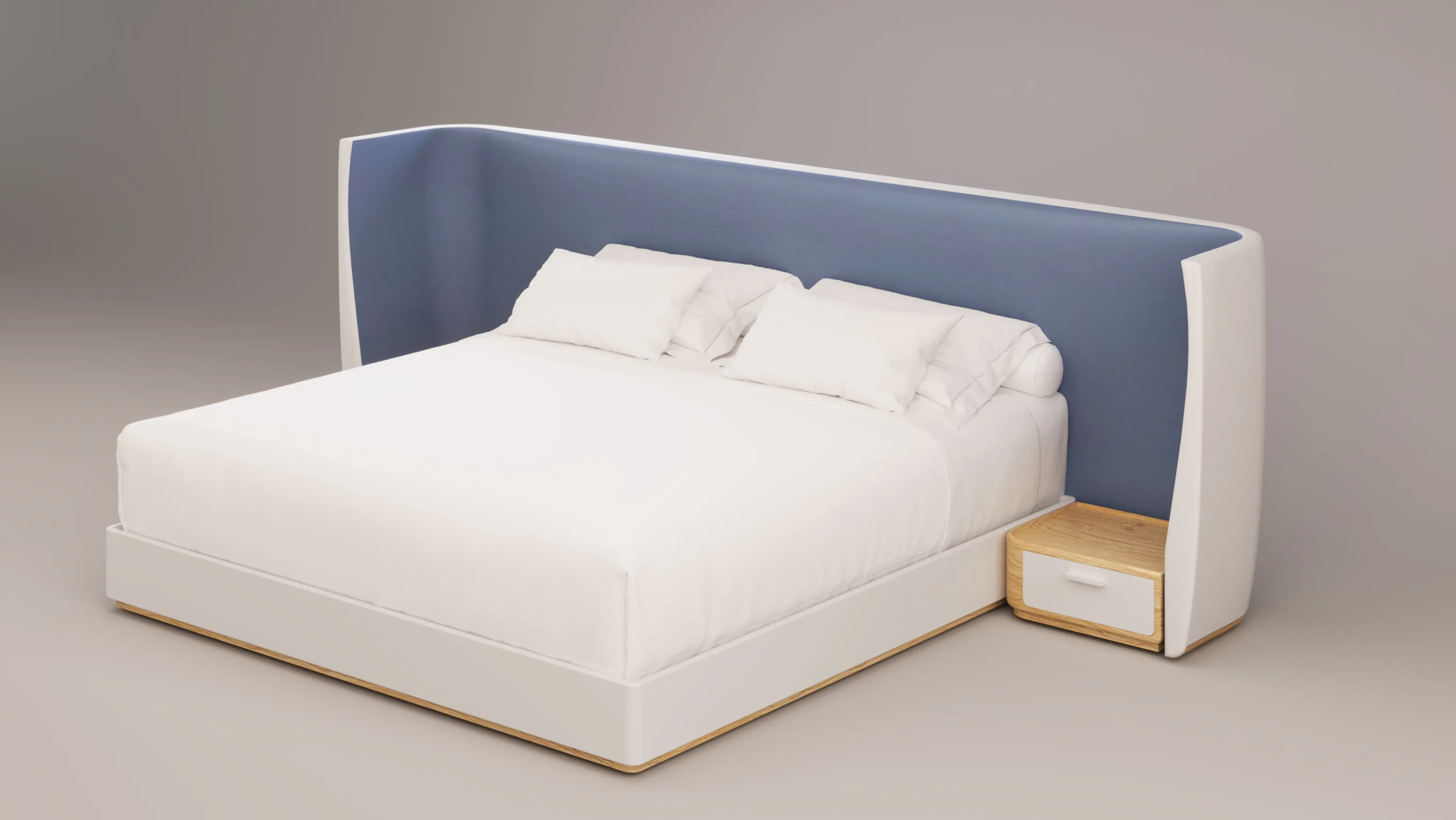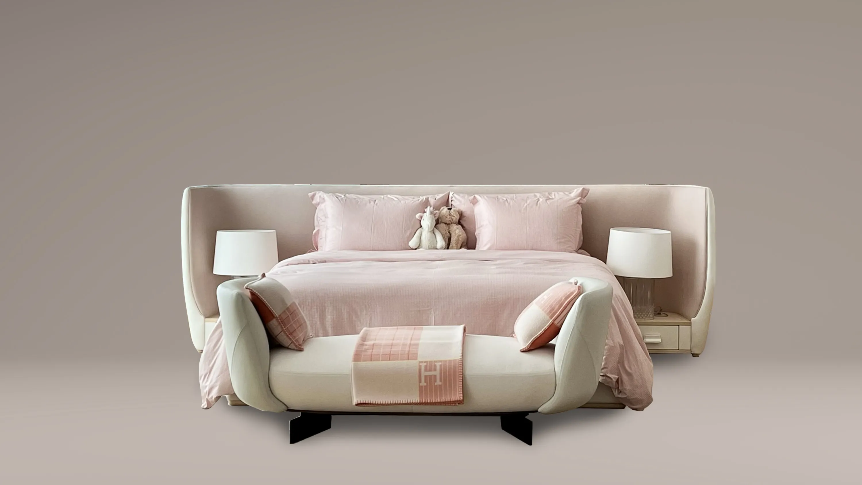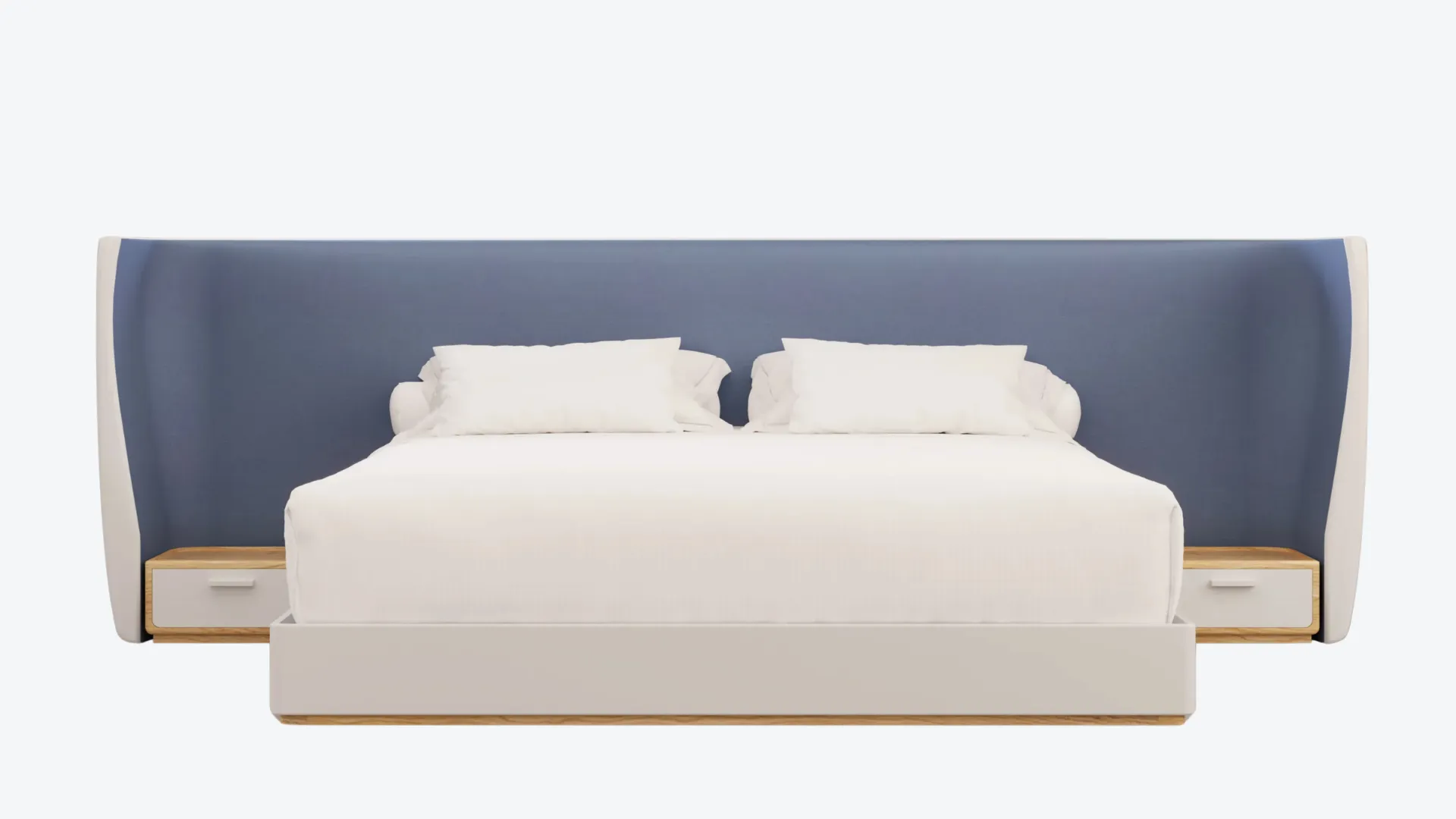 This bedframe features an external divan structure and drawer crafted in sycamore-veneered plywood, elegantly upholstered in Bianco Ottico leather. The internal headboard introduces a refined contrast in Romo Linara fabric, available in Nordic Blue or Rose Quartz. Balanced in tone and texture, the composition unites fine timber, supple leather, and soft textile in a quiet expression of contemporary craftsmanship. Handcrafted in Italy.