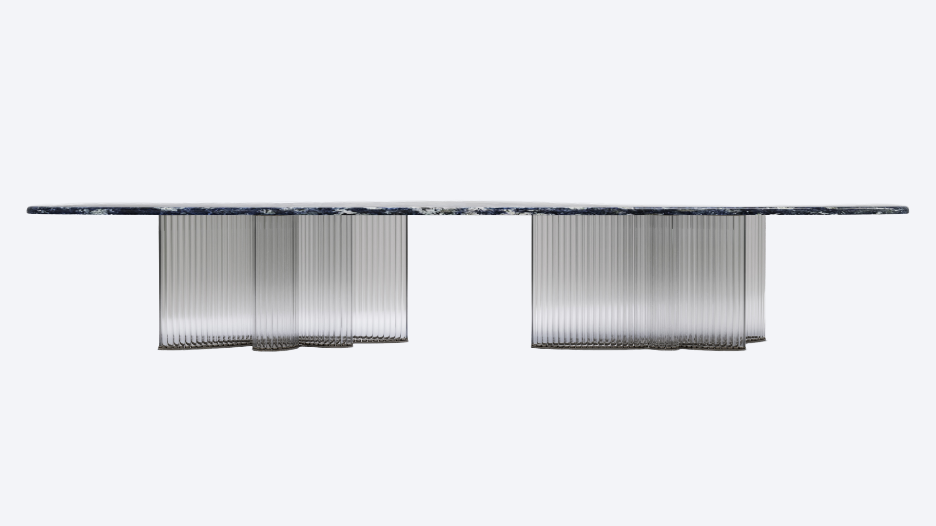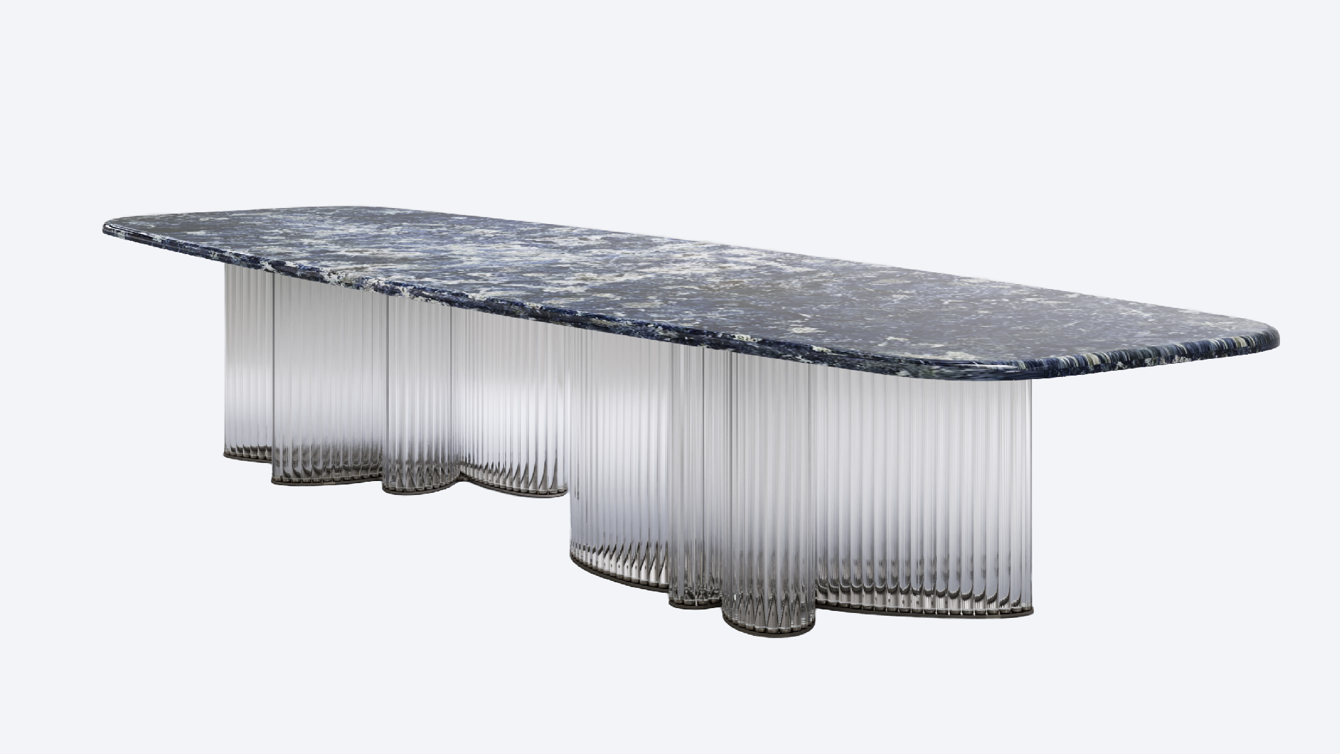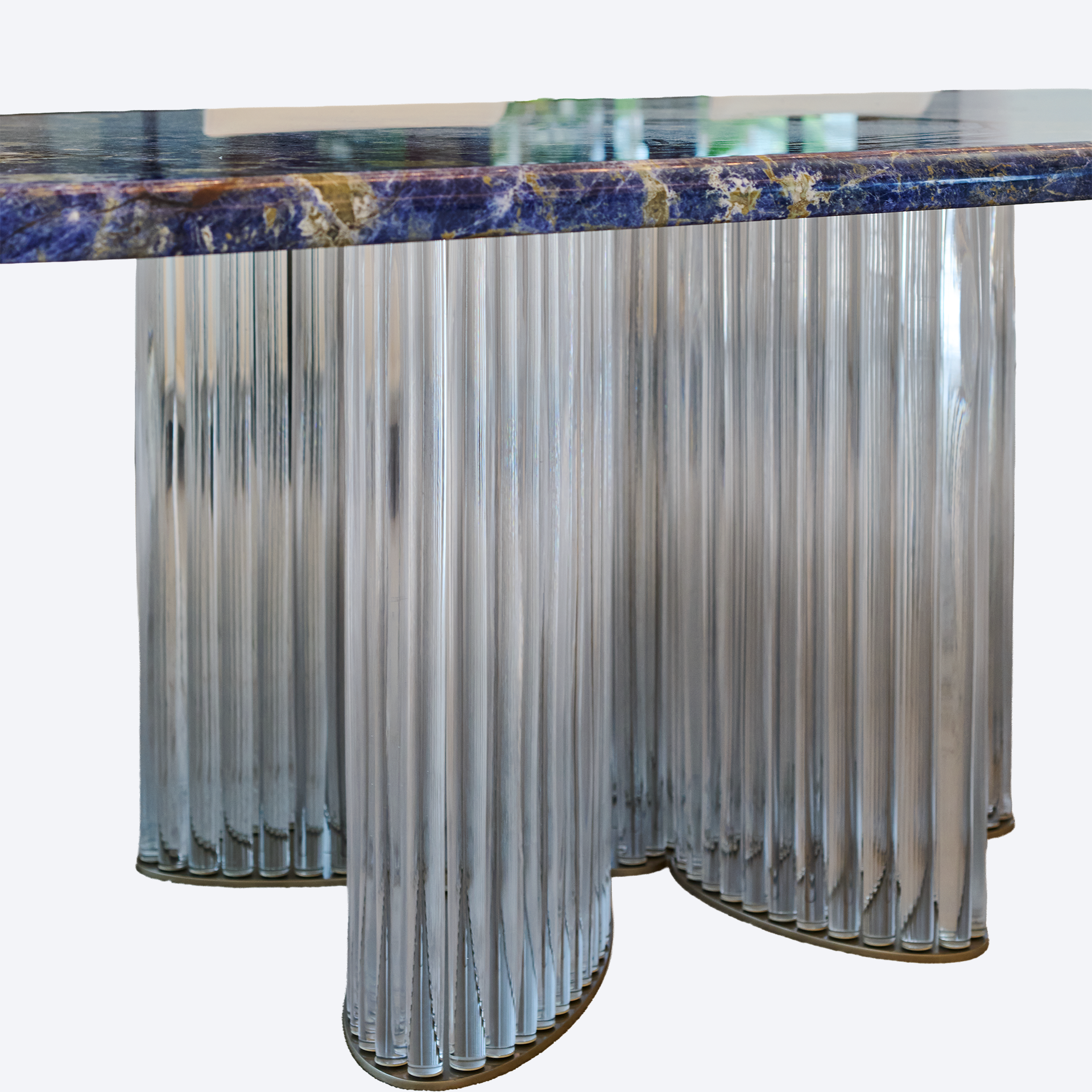 Formed from Van Antolini’s Lapis Blue collection, this dining table top reveals the striking depth of royal blue sodalite —its vivid interplay of color and mineral veining evoking the movement of ocean currents in stone. The base, composed of artisanal blown-glass rods from Murano, celebrates the enduring mastery of Venetian glassmaking. Together, stone and glass converge in a composition of light, color, and craftsmanship—an ode to natural splendour shaped by human hand.